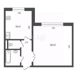Квартира очень уютная, вариант "заходи и живи". Кухня-гостиная 18,8 кВ.м и спальня 8,8 кв.м, раздельный санузел.