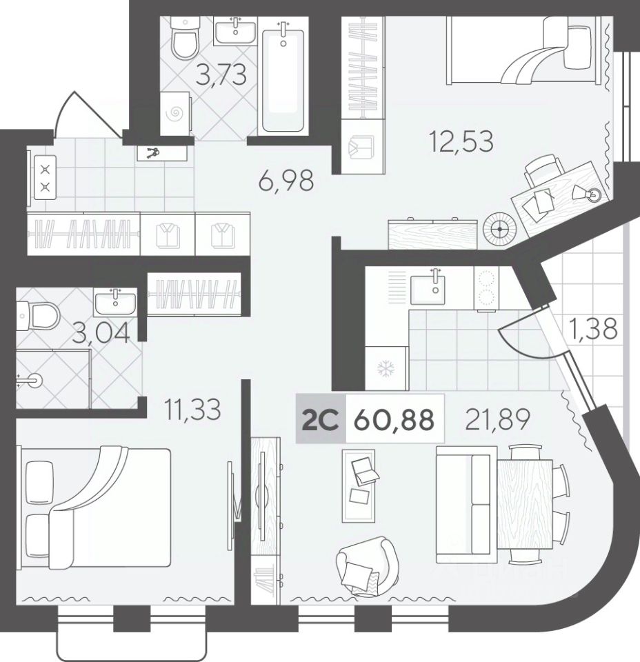 Двухкомнатная квартира 60.88 кв.м на 7 этаже — это удобное пространство для комфортной жизни. Отдельные спальни позволят каждому члену семьи иметь личное пространство. В кухне-гостиной комфортно вместе готовить, проводить семейные ужины или настольные игры с друзьями.