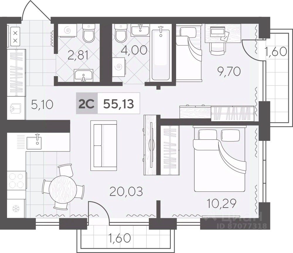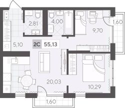 Квартира с двумя спальнями площадью 55.13 кв.м на 7 этаже. Продуманная геометрия комнат позволит легко зонировать пространство для личного досуга и места, где удобно проводить время с семьей или встречать гостей.