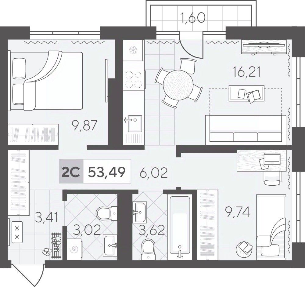 Двухкомнатная квартира 53.49 кв.м на 7 этаже — это удобное пространство для комфортной жизни. Отдельные спальни позволят каждому члену семьи иметь личное пространство. В кухне-гостиной комфортно вместе готовить, проводить семейные ужины или настольные игры с друзьями.