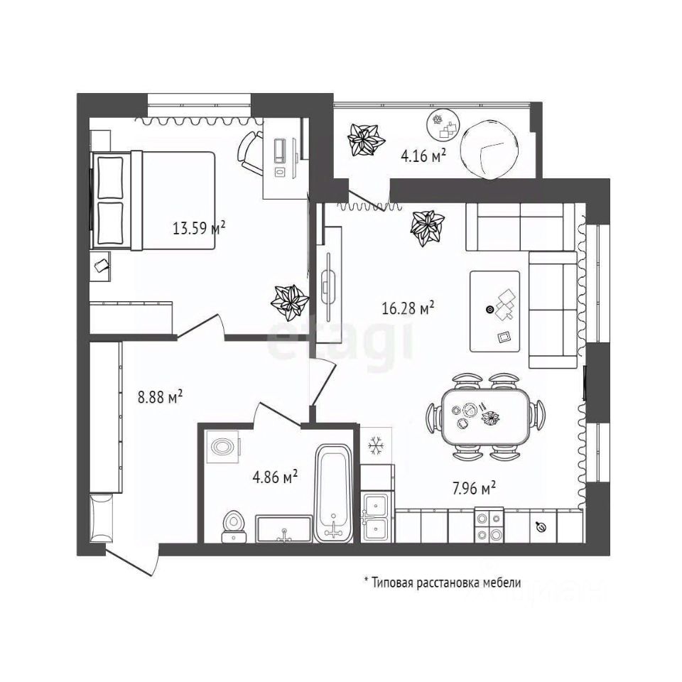 Светлая, просторная квартира расположенная на 4-м этаже состоящая из спальни площадью 13,59 кв.м., гостиной 16,28 кв.м., и следующих вспомогательных помещений: кухня площадью 7,96 кв.м. (кухня не отделена внутренней перегородкой от гостиной), совмещённый санузел площадью 4,86 кв.м., коридор площадью 8,88 кв.м., а также лоджии площадью 2,08 кв.м. (с учётом понижающего коэффициента 0,5).