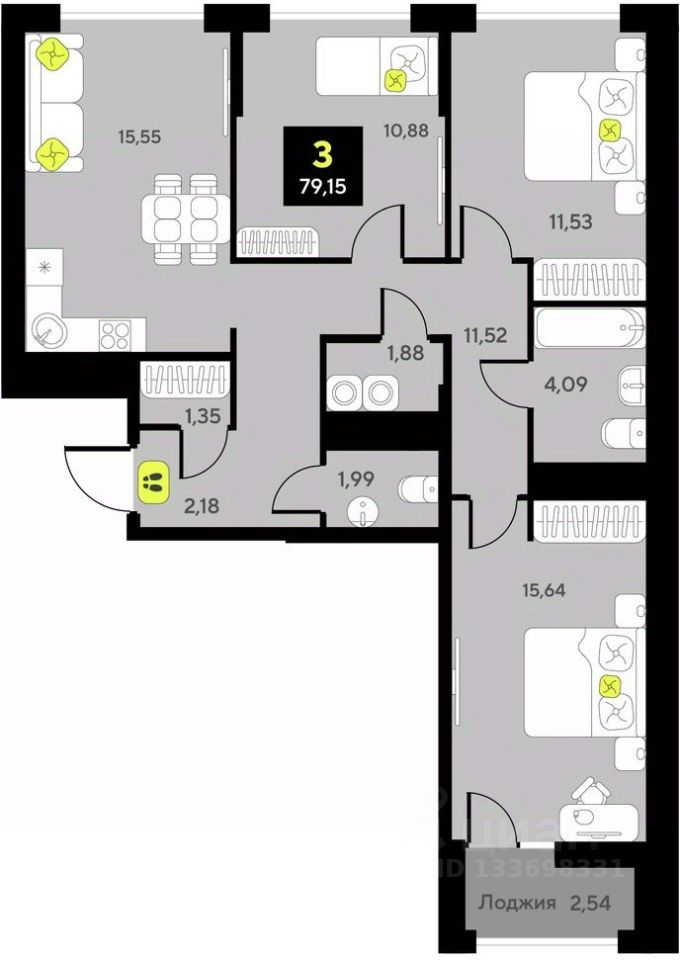 Продается 3-комн. квартира с предчистовой отделкой в ЖК "Мотивы" на 3 этаже. Общая площадь: 79.15 кв.м., жилая: 38.05 кв.м., площадь просторной кухни-столовой: 15.55 кв.м. Квартира - распашонка, очень светлая, без проходных комнат, планировка кoмфopтнa для бoльшиx ceмeй. В квартире одна лоджия, один совмещенный и один раздельный санузел. Высота потолков 2.7 м.