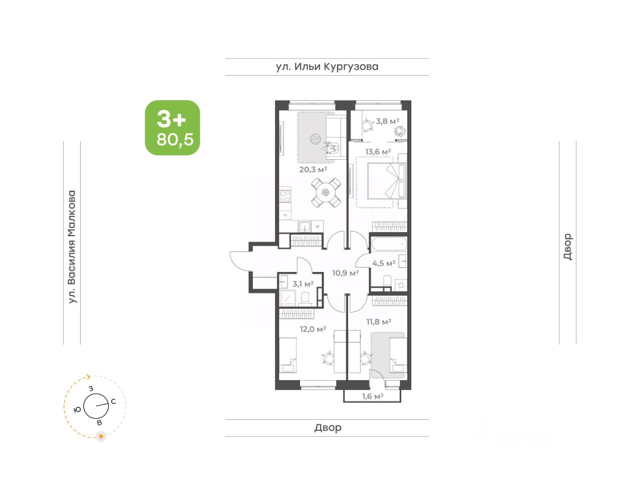Квартира 3+ с окнами на 2 стороны Самая популярная по спросу квартира это квартира с окнами на 2 стороны света! Здесь идеально все! • Просторная кухня-гостиная с широким окном • Спальня с выделенной зоной, которую вы можете использовать как кабинет или зону отдыха • 2 детские с видом на двор и променад • Французский балкон • Два удобных санузла, где вместится все необходимое • Вместительный двойной холл с двумя нишами под шкафы-купе