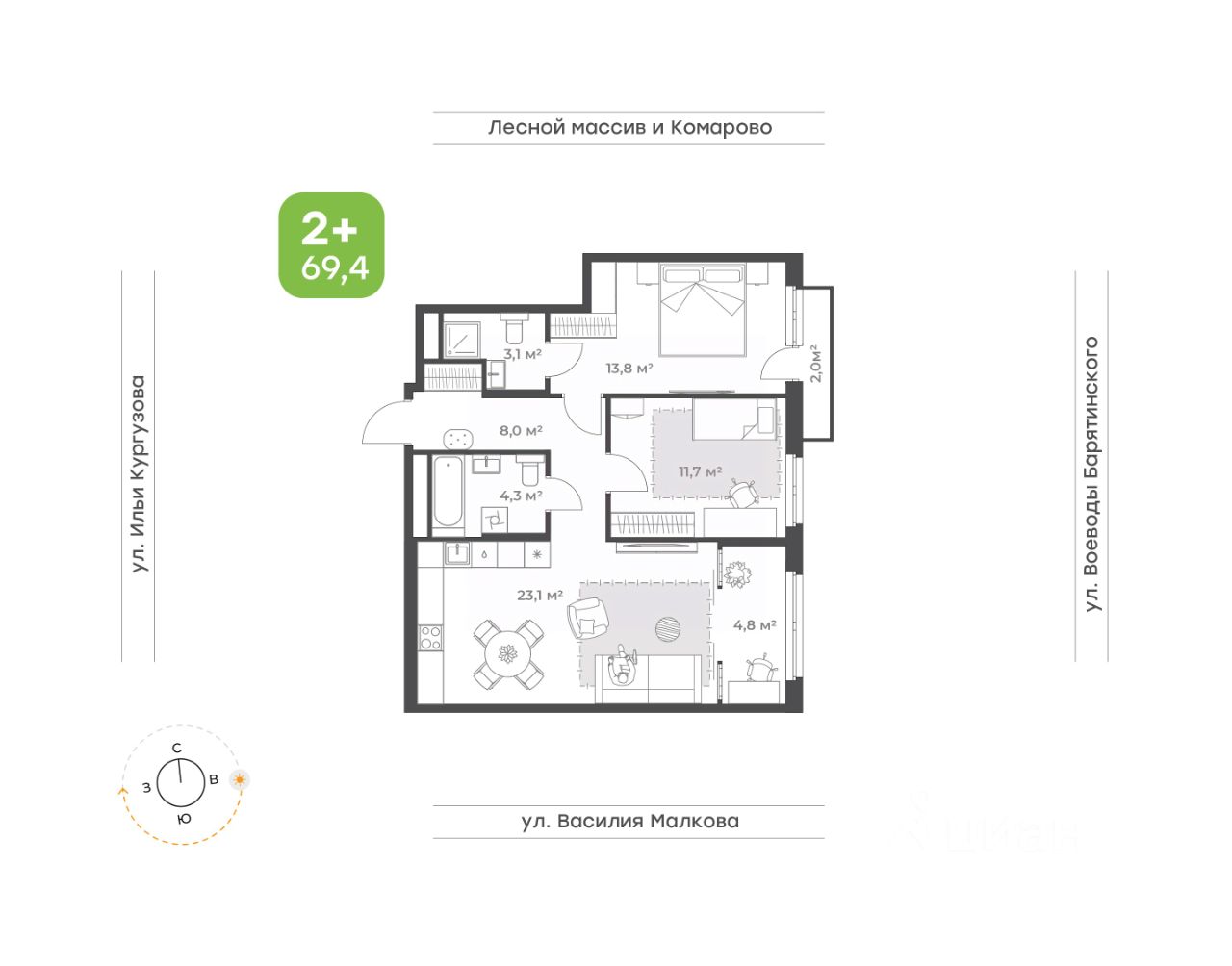 • Большая кухня-гостиная с выделенной зоной под кабинет или зону отдыха