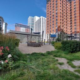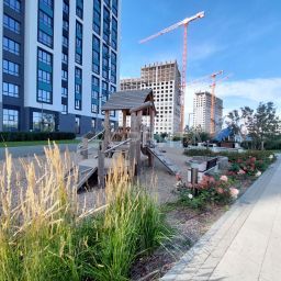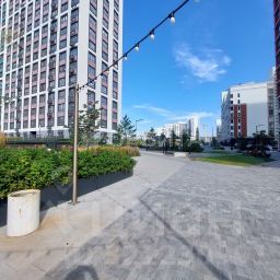 - Во дворах — благоустроенные зеленые зоны, детские и спортивные площадки, а также специальные пространства для выгула домашних питомцев. Важное преимущество — дворы свободны от автомобилей для безопасности и удобства жителей.