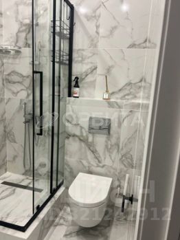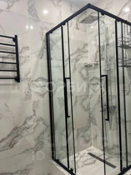 * В ванной — стеклянная душевая кабина, подвесная мебель, унитаз с инсталляцией.