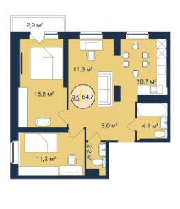 3-комн. квартира, 64,7 м²