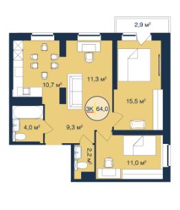 Продаётся 3-комнатная квартира в сданном доме (ГП-1), срок сдачи: I-кв. 2023, общей площадью 64 кв.м., на 15 этаже.