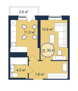 1-комн. квартира, 35,9 м²