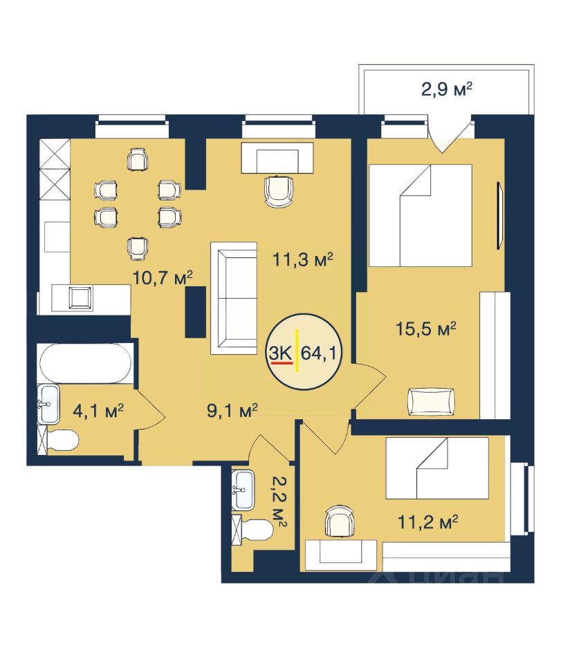 Продаётся 3-комнатная квартира в сданном доме (ГП-1), срок сдачи: I-кв. 2023, общей площадью 64.1 кв.м., на 6 этаже.