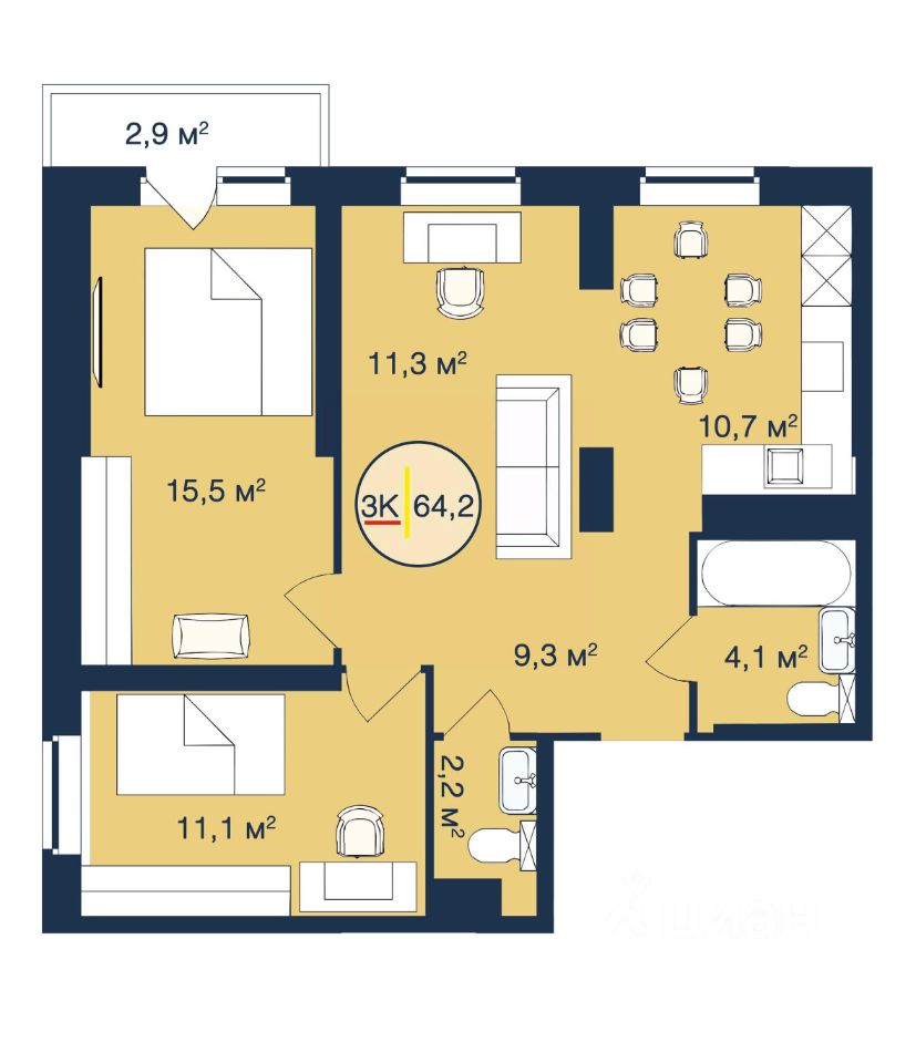 Продаётся 3-комнатная квартира в сданном доме (ГП-1), срок сдачи: I-кв. 2023, общей площадью 64.2 кв.м., на 10 этаже.