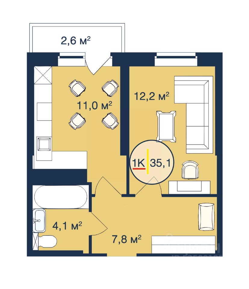 1-комн. квартира, 35,1 м²