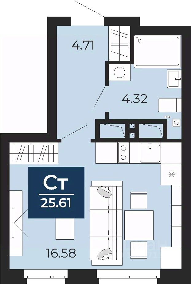 Однокомнатная квартира-студия от застройщика с предчистовой отделкой в ЖК "Прео" на 23 этаже. Общая площадь: 25.61 кв.м., площадь гостиной 16.58 кв.м., из которых 5 кв.м. выделено под кухонную зону. Все окна выходят на одну сторону. В квартире один совмещенный санузел. Высота потолков 2.7 м.
