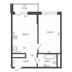 Отличная функциональная планировка, включает в себя просторную кухню-гостиную 18 кв.м., спальню 15.68 кв.м., прихожую и совмещенный сан.узел.