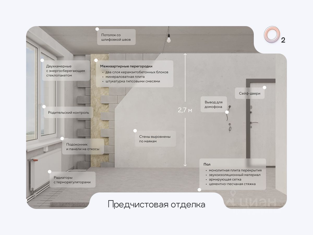 В квартире выполнена предчистовая отделка, поэтому ремонт пройдёт проще и быстрее. Стены выровнены и оштукатурены, пол готов к финишному покрытию. Установлены входная сейф-дверь, пластиковые окна, розетки и выключатели.