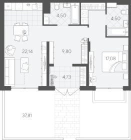Уютная однокомнатная квартира 62.75 кв.м на 1 этаже. Функциональная планировка позволяет удобно организовать быт, а кухня-гостиная подойдёт для отдыха и общения.