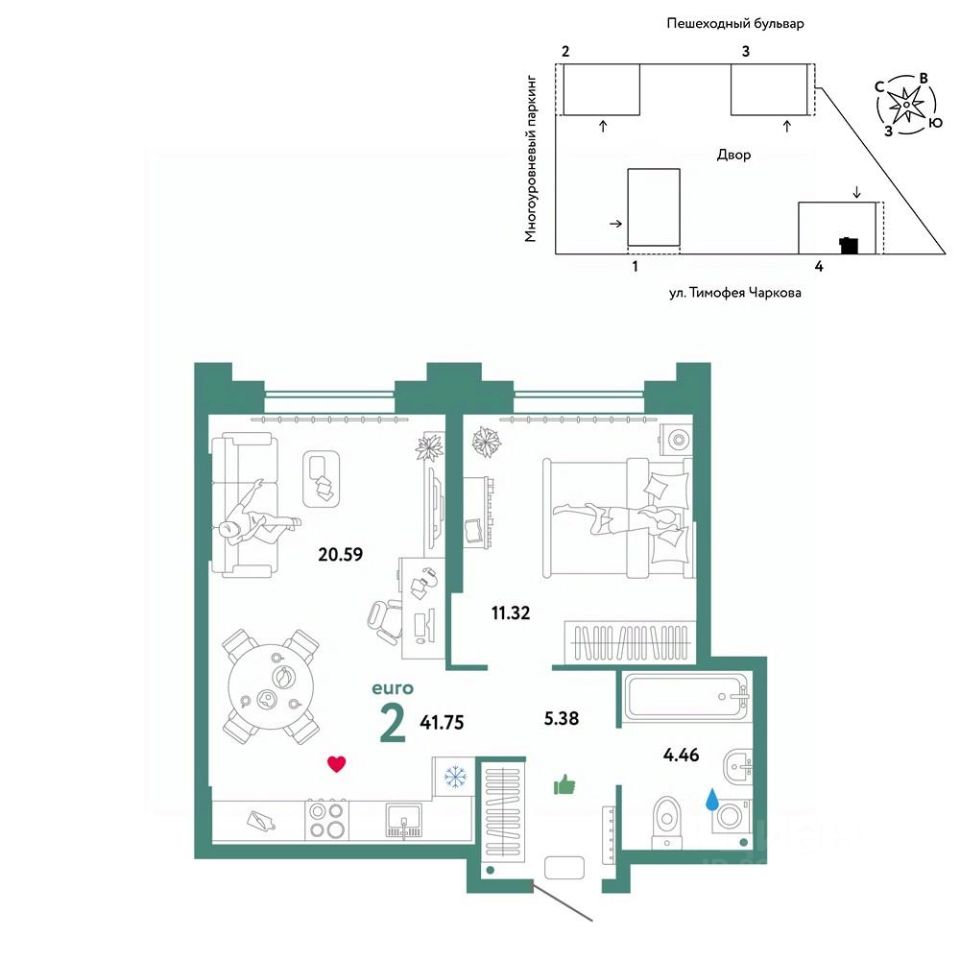 Продается 2комнатная квартира от застройщика "Страна Девелопмент". Стоимость указана без учета акций. Квартира на 14 этаже, площадь квартиры 41,75 кв. м. Сдача — в 3 квартале 2025 года.