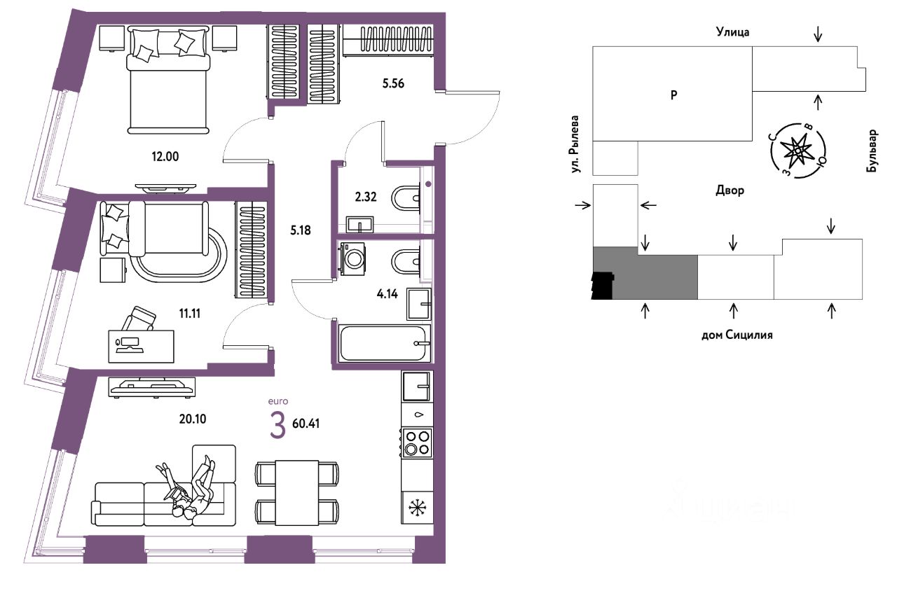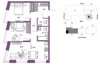 Продается 3комнатная квартира на 13 этаже от застройщика Страна Девелопмент. Площадь квартиры 60,41 кв. м.