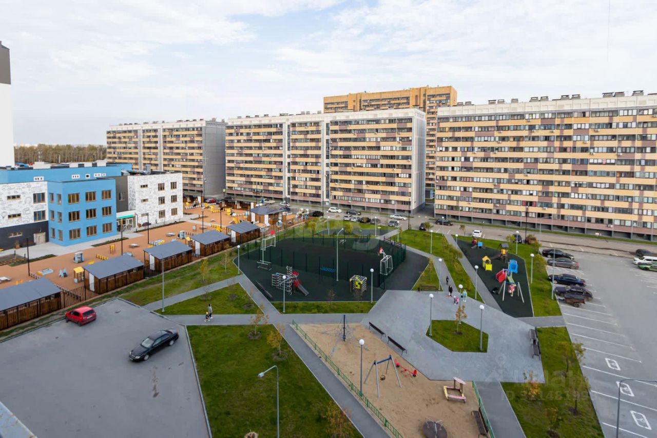 Во дворе новый детский сад, яркая детская площадка, много парковочных мест.