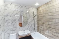 На полу ламинат 33 класса, матовые натяжные потолки, люстра, точечные светильники, санузел облицован современным керамогранитом.