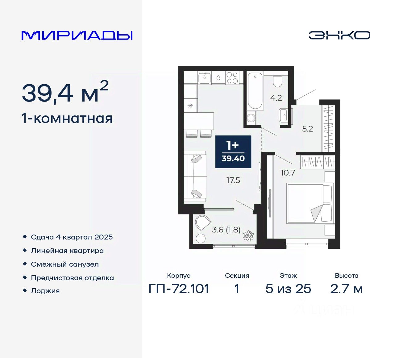 Продается однокомнатная квартира от застройщика с предчистовой отделкой в ЖК "Мириады" на 5 этаже. Общая площадь: 39.4 кв.м., жилая: 10.7 кв.м., площадь просторной кухни-столовой: 17.5 кв.м. Все окна выходят на одну сторону. В квартире одна лоджия, один совмещенный санузел. Высота потолков 2.7 м.