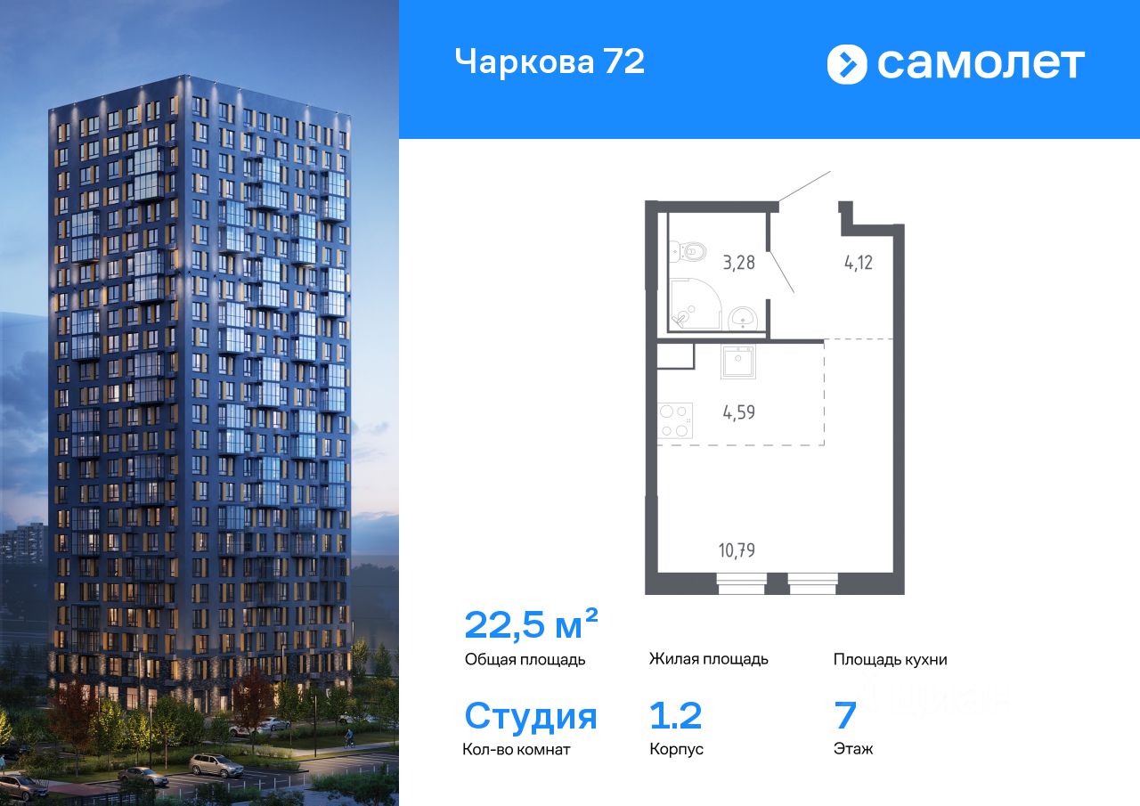 Строим кварталы для жизни с заботой о будущем. Предлагается квартира студия комфорт-класса 22,5 кв.м в корпусе 1.2 на 7 этаже, в ЖК "Чаркова 72"