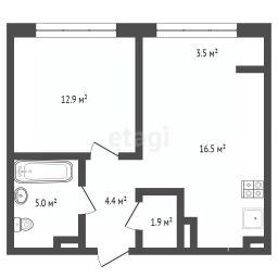 теплая лоджия 3.5 м2, кухня-гостиная 16.5 м2, кладовая 1.9 м2, санузел 5 м2, спальня 12.9 м2;