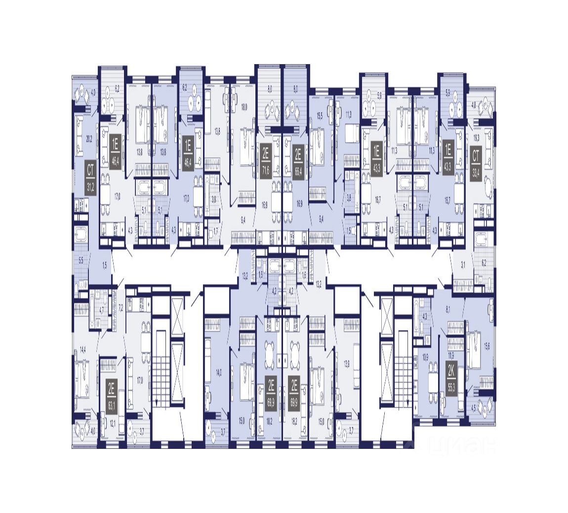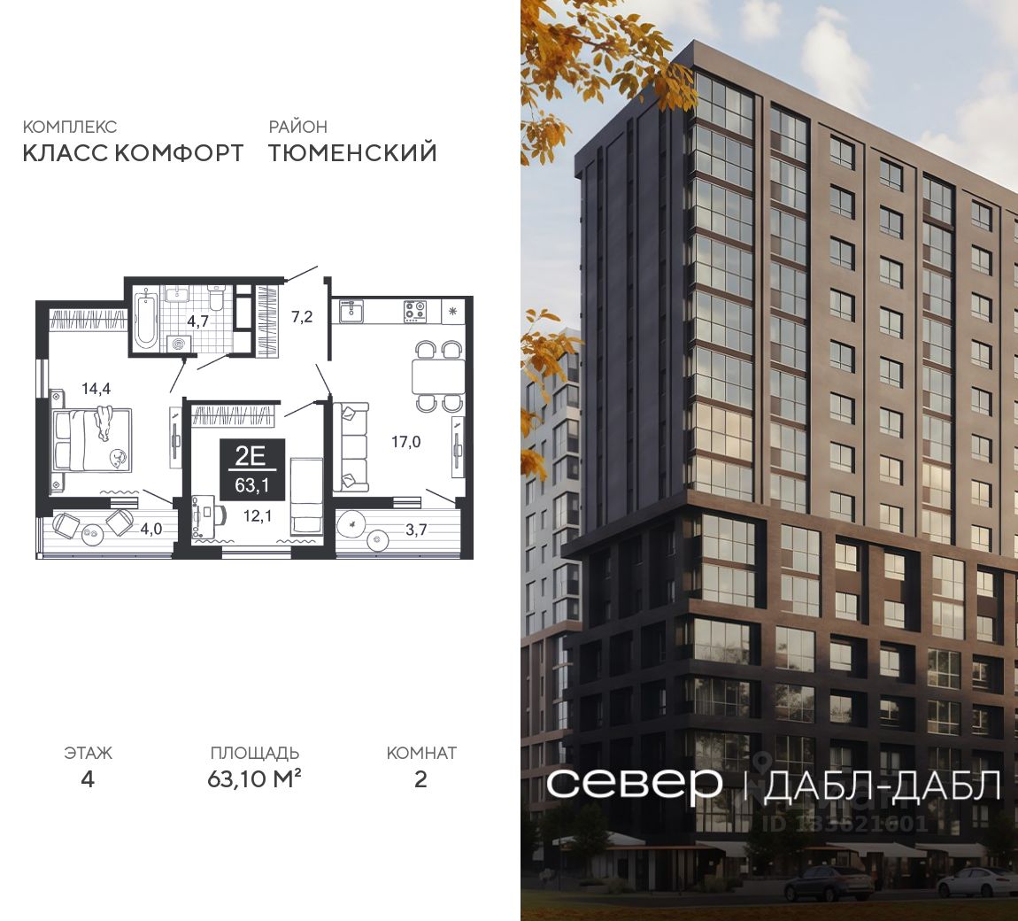 Продаётся квартира площадью 63.10 м2 в жилом комплексе "Дабл-Дабл". Квартира находится на 4 этаже, жилая площадь квартиры 26.50 м2, площадь просторной кухни — 17.00 м2. Среди особенностей планировки — изолированные комнаты с окнами на одну сторону, 1 совмещённый санузел.