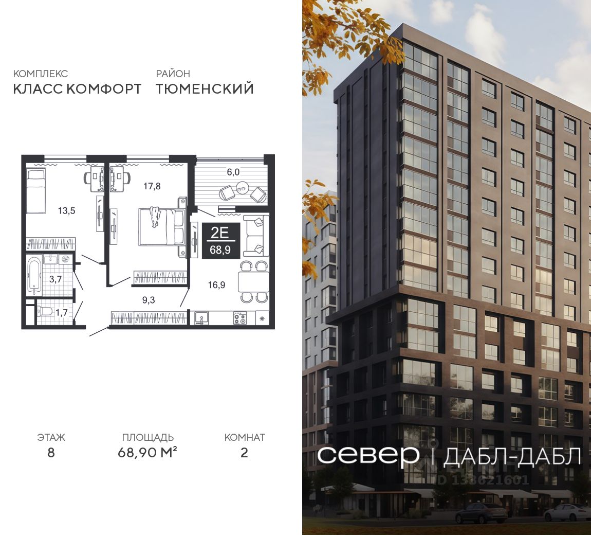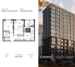 Продаётся квартира площадью 68.90 м2 в жилом комплексе "Дабл-Дабл". Квартира находится на 8 этаже, жилая площадь квартиры 31.30 м2, площадь просторной кухни — 16.90 м2. Среди особенностей планировки — изолированные комнаты с окнами на одну сторону, 1 совмещённый санузел.