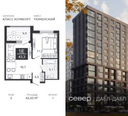 Продаётся квартира площадью 43.30 м2 в жилом комплексе "Дабл-Дабл". Квартира находится на 3 этаже, жилая площадь квартиры 11.30 м2, площадь просторной кухни — 16.70 м2. Среди особенностей планировки — изолированные комнаты с окнами на одну сторону, 1 совмещённый санузел.