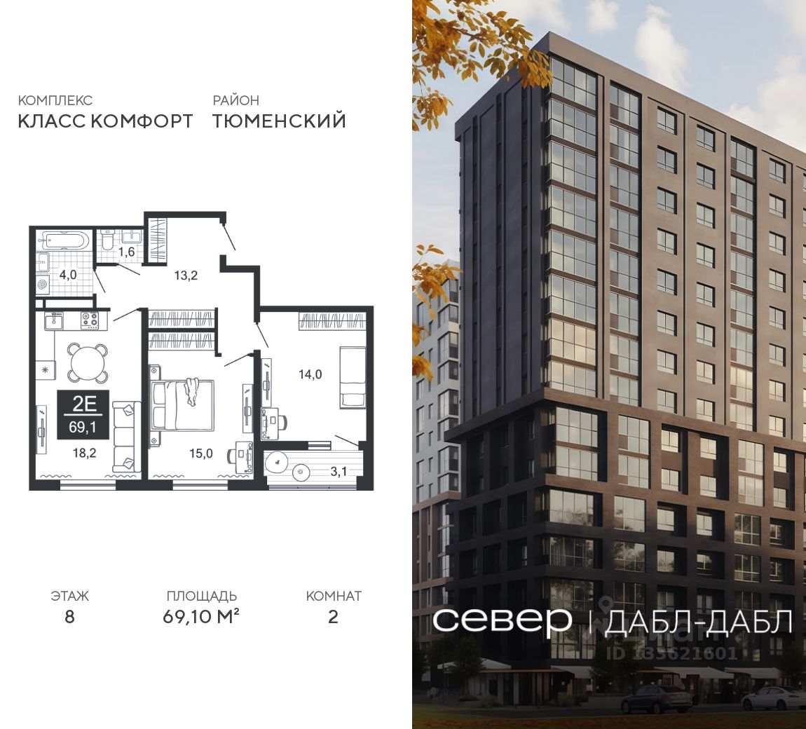 Продаётся квартира площадью 69.10 м2 в жилом комплексе "Дабл-Дабл". Квартира находится на 8 этаже, жилая площадь квартиры 29.00 м2, площадь просторной кухни — 18.20 м2. Среди особенностей планировки — изолированные комнаты с окнами на одну сторону, 1 совмещённый санузел.