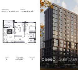 Продаётся квартира площадью 65.50 м2 в жилом комплексе "Дабл-Дабл". Квартира находится на 8 этаже, жилая площадь квартиры 26.80 м2, площадь просторной кухни — 16.90 м2. Среди особенностей планировки — изолированные комнаты с окнами на одну сторону, 1 совмещённый санузел.