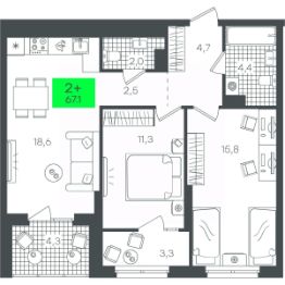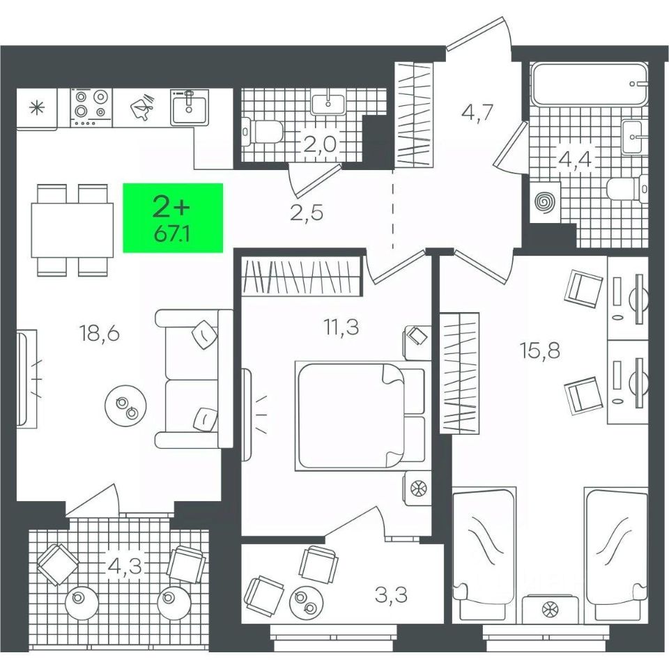 Продаётся 2-комнатная квартира в строящемся доме (3-В6.1 (Малкова, 15)), срок сдачи: III-кв. 2026, общей площадью 67.13 кв.м., на 11 этаже. Компания 4D приступила к строительству нового жилого комплекса "Гранд квартал". Новый ЖК находится в зеленой зоне Калининского района, южнее микрорайона Тюменская слобода.