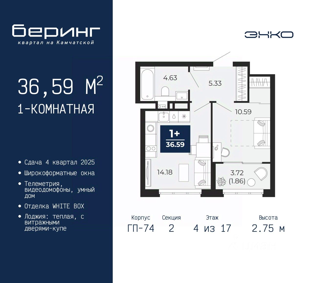 Однокомнатная квартира в ЖК "Беринг" на 4 этаже. Квартира без отделки, после выдачи ключей можно делать ремонт. Общая площадь: 36.59 кв.м., жилая: 10.59 кв.м., площадь просторной кухни-столовой: 14.18 кв.м. Все окна выходят на одну сторону. В квартире одна лоджия, один совмещенный санузел. Высота потолков 2.75 м.