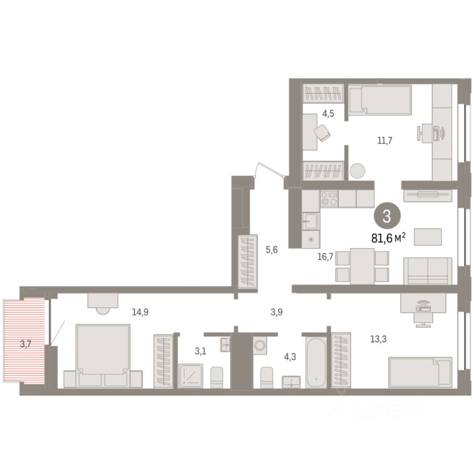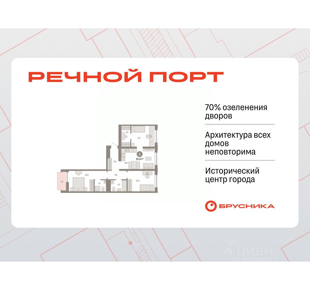 Квартира с кухней-гостиной и тремя спальнями в жилом районе "Речной порт". Особенности планировки: гардеробная, вид во двор, разнесённые спальни, предчистовая отделка, мастер-спальня, балкон.
