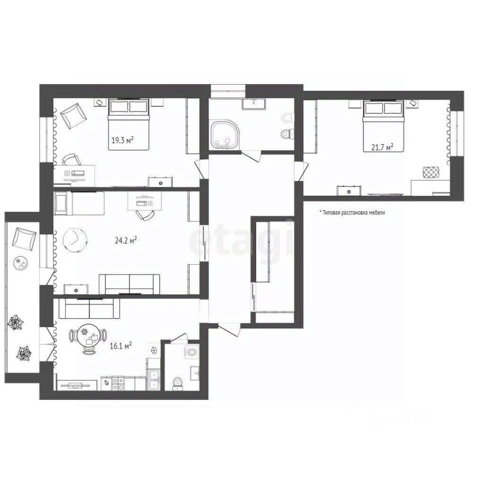 Идеальная супер-функциональная планировка включает в себя: кухню-столовую более 16 кв.м. с выходом на огромную (на ширину двух комнат) застекленную лоджию, гостиную 24.2 кв.м. (она может быть, по Вашим потребностям, жилой комнатой, например, спальней родителей, детской для нескольких детей), две жилые комнаты (спальни либо одна их них может быть рабочим кабинетом) 19.3 и 21.7 кв.м., два сан.узла - небольшой - гостевой недалеко от входа, второй большой с окном - приватный и большая удобная гардеробно-хозяйственная комната.