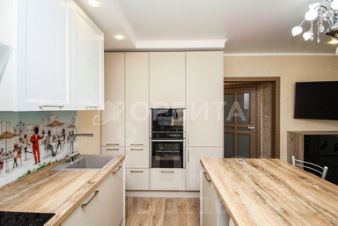 • Кухня с красивым кухонным гарнитуром и всей необходимой техникой от Neff (Германия): вытяжка, варочная поверхность, посудомоечная машина, микроволновая печь и духовой шкаф. Большая столешница острова с выкатной розеткой — идеальное место для кулинарных шедевров!