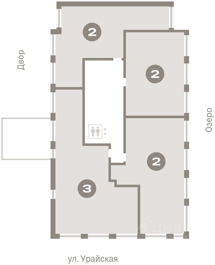 Квартира с кухней-гостиной и тремя спальнями в Доме у озера. Особенности планировки: окна в пол, вид во двор, панорамное остекление, тёплая лоджия, лоджия, предчистовая отделка, мастер-спальня, терраса на крыше.