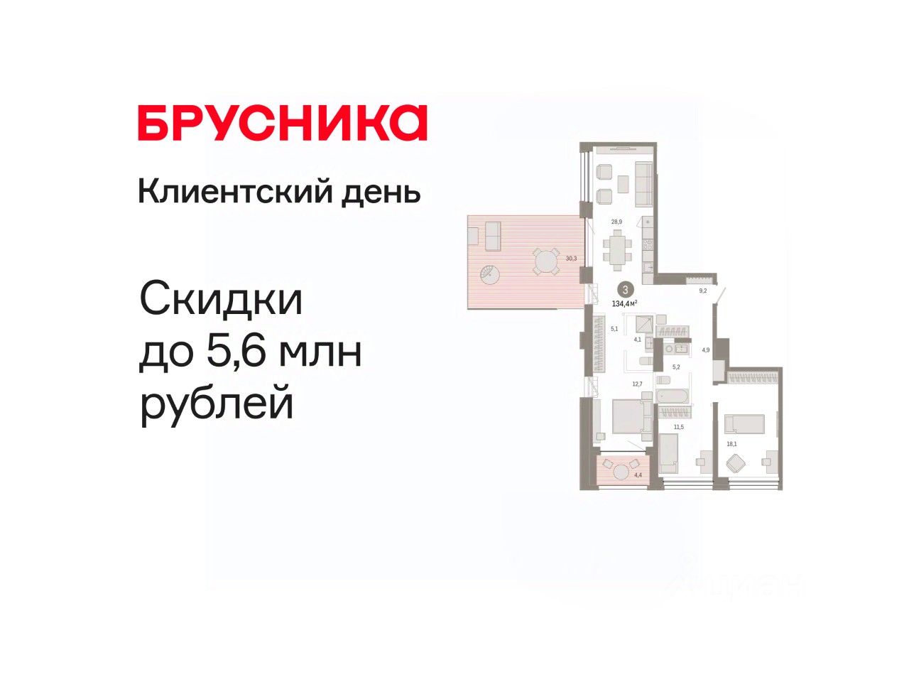 Просторная 3-комн. квартира с предчистовой отделкой в ЖК "Дом у озера" на 5 этаже. Общая площадь: 134.4 кв.м. Высота потолков 2.7 м.