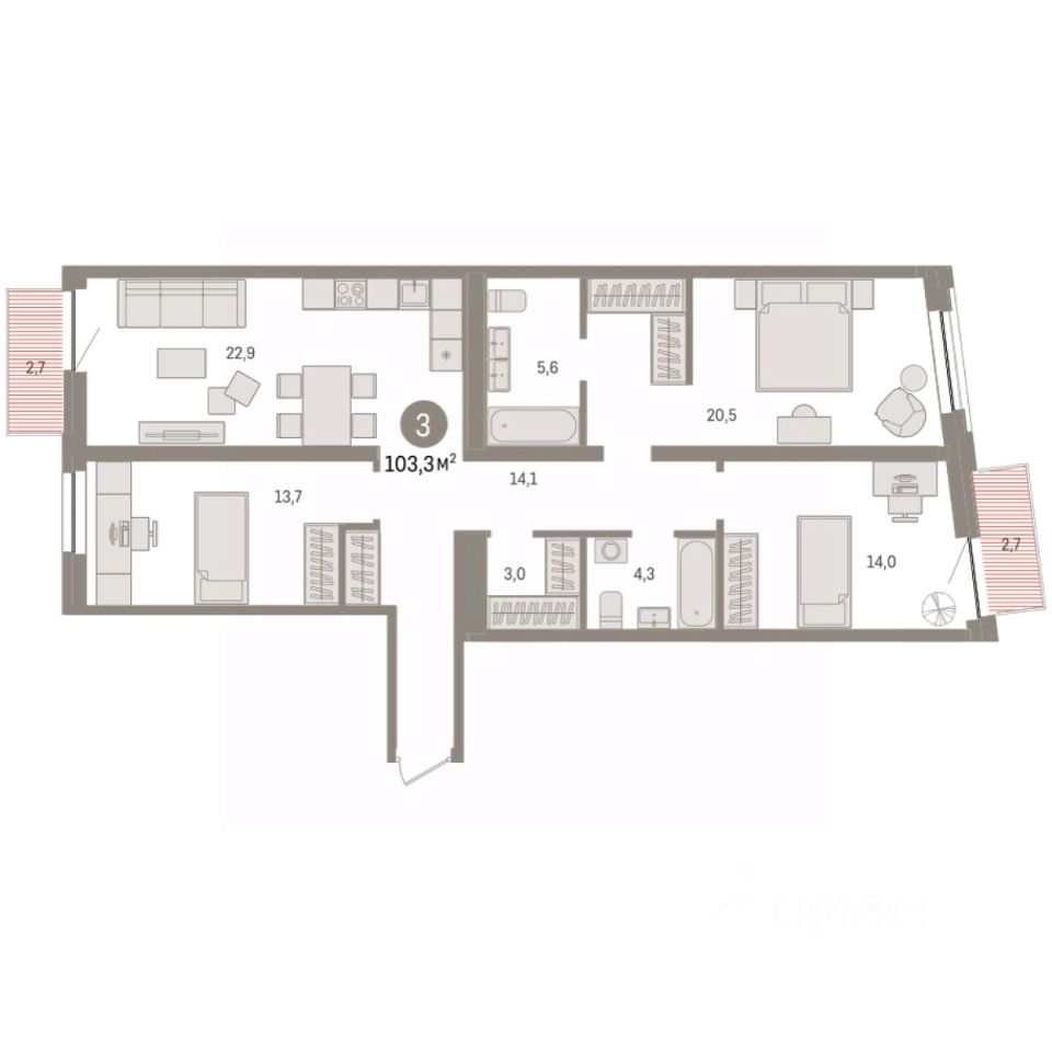Квартира с кухней-гостиной и тремя спальнями в жилом районе "Речной порт". Особенности планировки: окна на две стороны, гардеробная, вид во двор, разнесённые спальни, предчистовая отделка, мастер-спальня, балкон.