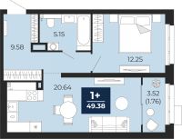1-комн. квартира от застройщика с предчистовой отделкой в ЖК "Прео" на 2 этаже. Общая площадь: 49.38 кв.м., жилая: 12.25 кв.м., площадь просторной кухни-столовой: 20.64 кв.м. Все окна выходят на одну сторону. В квартире одна лоджия, один совмещенный санузел. Высота потолков 2.7 м.