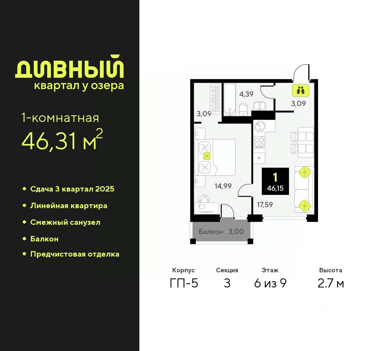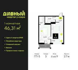 1-комн. квартира с предчистовой отделкой в ЖК "Дивный квартал у озера" на 6 этаже. Общая площадь: 46.31 кв.м., жилая: 14.99 кв.м., площадь просторной кухни-столовой: 17.59 кв.м. Все окна выходят на одну сторону. В квартире один балкон, один совмещенный санузел. Высота потолков 2.7 м.