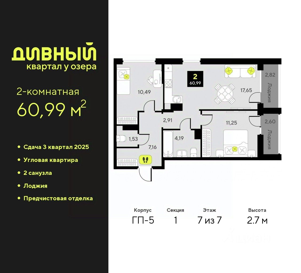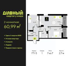 Двухкомнатная квартира от застройщика с предчистовой отделкой в ЖК "Дивный квартал у озера" на 7 этаже. Общая площадь: 60.99 кв.м., жилая: 21.74 кв.м., площадь просторной кухни-столовой: 17.65 кв.м. Угловая квартира, идеально подойдет любителям тишины и панорамных видов. В квартире две лоджии, один совмещенный и один раздельный санузел. Высота потолков 2.7 м.