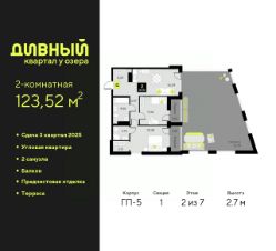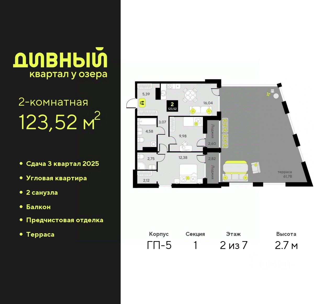 2-комн. квартира с предчистовой отделкой в ЖК "Дивный квартал у озера" на 2 этаже. Общая площадь: 61.74 кв.м., жилая: 22.36 кв.м., площадь просторной кухни-столовой: 16.04 кв.м. Квартира угловая, очень светлая, естественная вентиляция при открытии окон. В квартире две лоджии, два совмещенных санузла. Высота потолков 2.7 м.