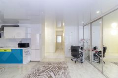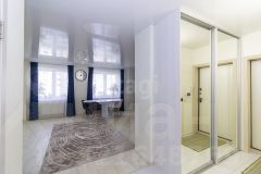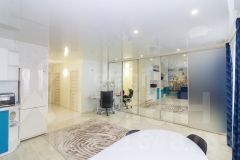 При входе расположен просторный шкаф-купе для верхней одежды. Основное пространство объединяет гостиную и кухню-столовую с двумя большими окнами. Кухонный гарнитур оснащен многочисленными системами хранения, варочной панелью, духовым шкафом и мощной вытяжкой. Здесь же находится вместительный шкаф-купе со встроенной нишей для телевизора. Вторая комната меньше по площади, но функционально организована и имеет выход на утепленную лоджию с дополнительными местами для хранения. Санузел совмещенный, установлена качественная сантехника, отдельное помещение отведено под прачечную зону. Во всей квартире установлены системы очистки воды.