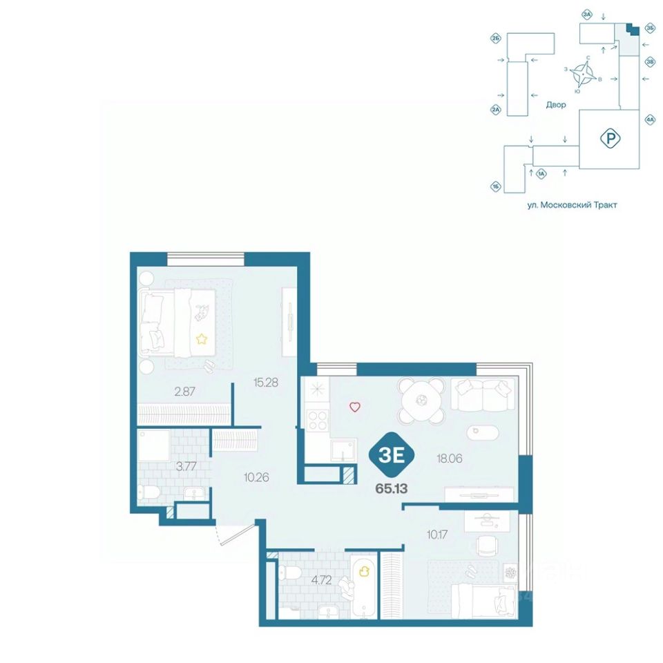 Двухкомнатная квартира с мастер-спальней, в которой есть своя гардеробная, большой кухней-гостиной с угловым остеклением, детской и двумя санузлами. Окна на две стороны.