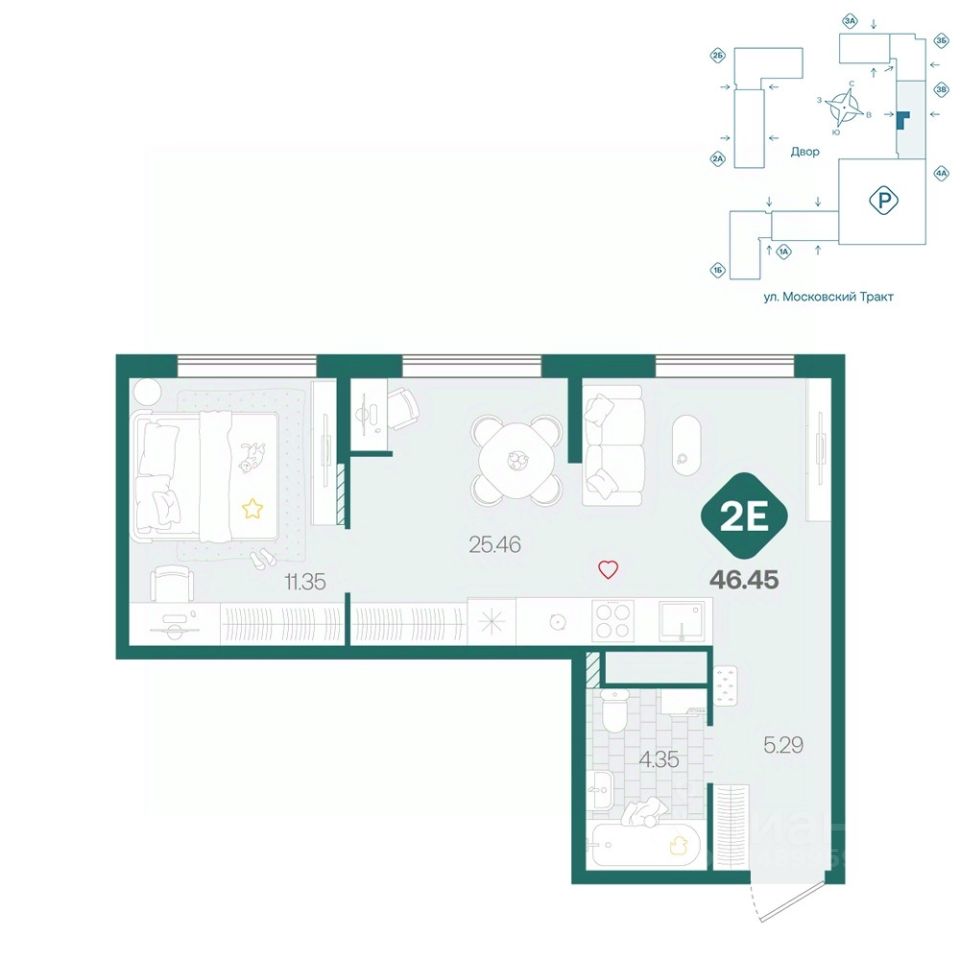 Двухкомнатная квартира с большой кухней более 25м², отдельной спальней с нишей для хранения и просторным санузлом. При входе удобная прихожая с нишей для вместительного шкафа.