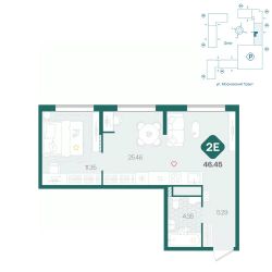 Двухкомнатная квартира с большой кухней более 25м², отдельной спальней с нишей для хранения и просторным санузлом. При входе удобная прихожая с нишей для вместительного шкафа.