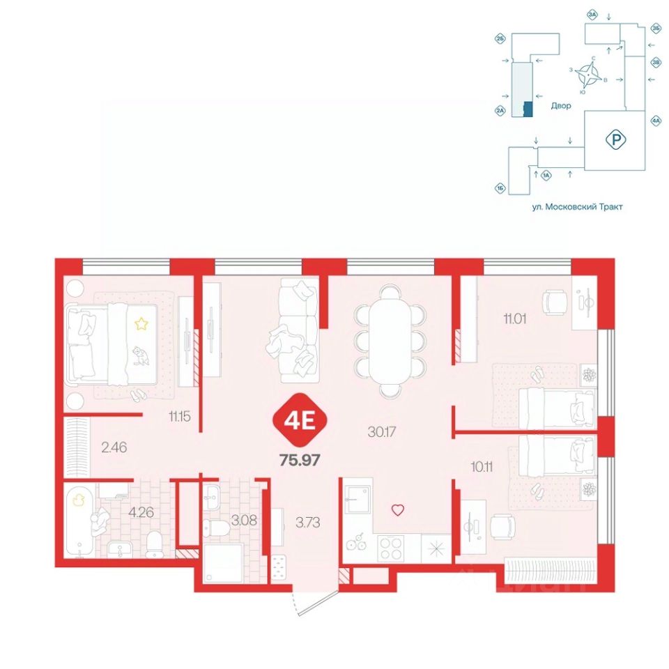 Просторная четырехкомнатная квартира форматас большой кухней-гостиной, мастер-спальней с гардеробной и приватнной ванной крмнатой. Спальни расположены на два крыла: в одном мастер-, в другом — две детские, в одной из которых окна на две стороны. В прихожей есть место под встроенный шкаф.
