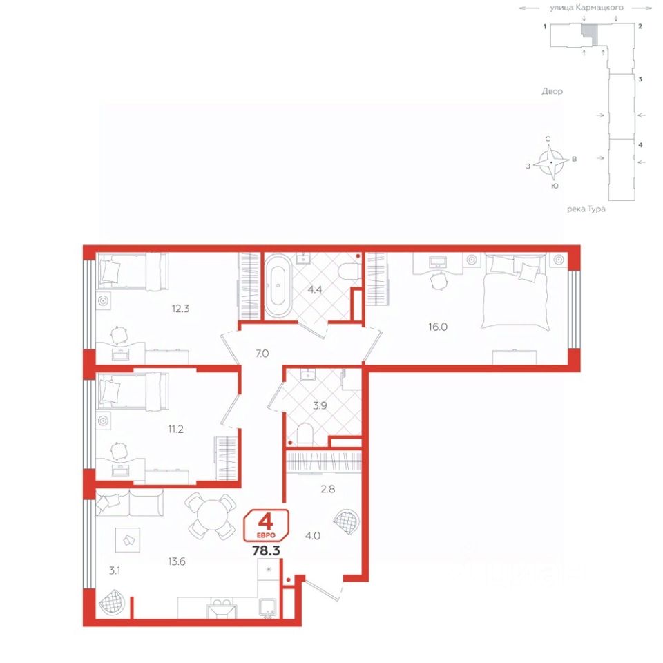 Евро-четырехкомнатная квартира с окнами на две стороны света предлагает идеальные условия для комфортной жизни.
